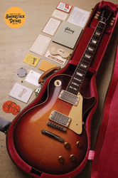 | Custombucker Alnico 3 (Unpotted) Pickups | Murphy Lab Aged Nitrocellulose Lacquer | Lightly Aged Hardware | No-Wire ABR-1 Bridge | 1-Piece Lightweight Mahogany Back | 2-Piece Plain Maple Top | Hide Glue Adhesives | Solid Mahogany Neck (50s Rounded Medium C) | Historic Gibson Narrow/Tall Frets | Indian Rosewood Fretboard | Aged Trapezoid Inlays | Cellulose Acetate Butyrate Plastics | Authentic '50s No-Tube Truss Rod | Kluson Single Line - Single Ring Tuners | CTS 500K Audio Taper Pots | Butyrate Gold Top Hats | Paper-in-Oil Capacitors | Amber Catalin Switch Tip | Aluminium Stop Bar | COA | Case Candy | Brown/Pink Lifton Reissue 5-Latch Case |