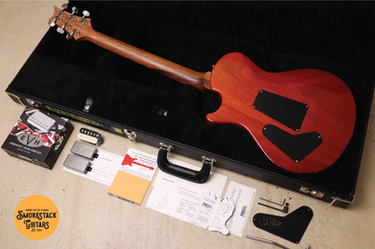 The case candy includes the PTC Skitchy signed note, PRS hang tag, PRS sticker (a bit worn), Description & Operating Instructions card, spare backplate (signed by Paul), case key, allen keys and truss rod wrench, etc.