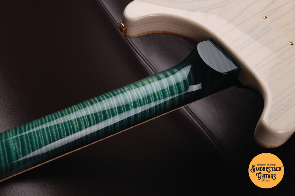 The swamp ash on the body's back provides the perfect pairing to the curly maple top & neck. Its (semi-translucent) white finish contrasts well with the Bahama Blue and natural scraped binding. We really love the matching swamp ash backplates for a very suave final touch!