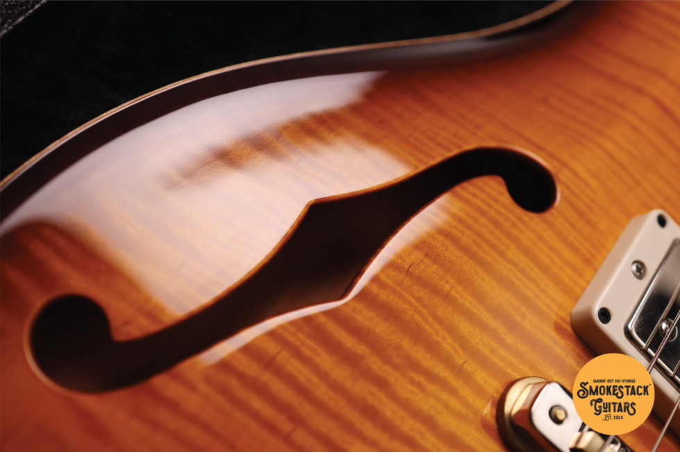 This guitar is loaded with a pair of 58/15 Low Turn humbuckers which are highly articulate yet prominently voiced. Both humbuckers can be tapped by their respective tone knobs, this combined with the semi-hollow construction make for an extremely tonally versatile instrument. It is most likely to become your main "Swiss Army Knife" guitar once in your arsenal!