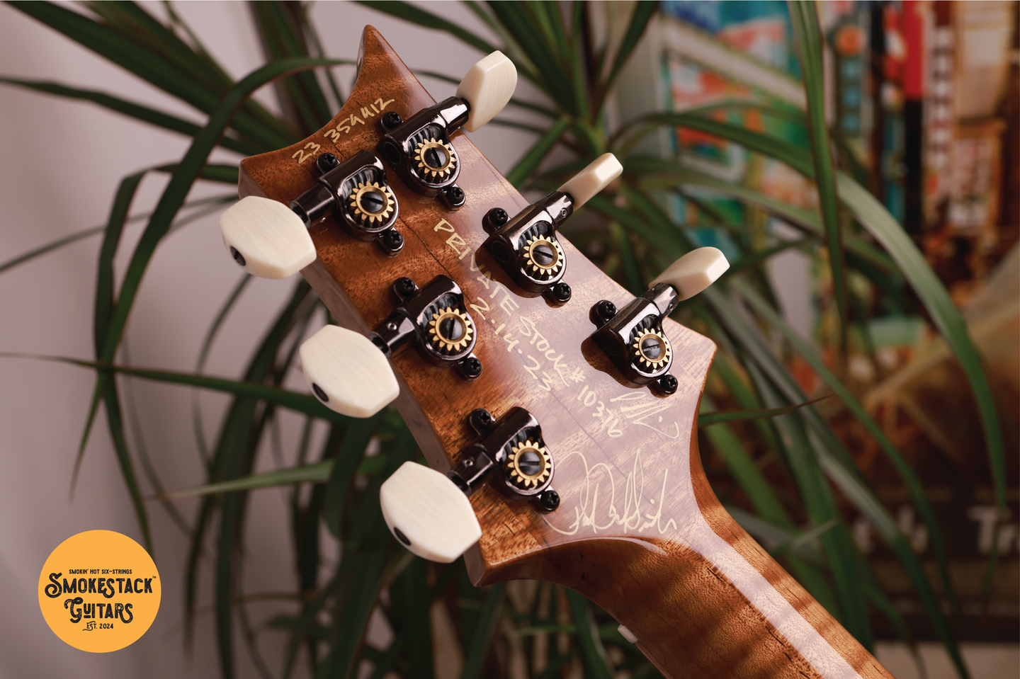 Continuing the dragon theme further, PRS' finest Smoked Black hardware is featured. The guitar is spec'd with a PRS Gen III tremolo bridge with locking saddles (unique to the Private Stock programme) and Phase III set-screw locking tuning pegs for the ultimate in tuning stability. The tuning pegs feature ivoroid buttons which are a superb match with the bone nut.