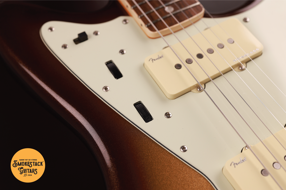 This model uniquely represents the first time Fender have ever offered a Noiseless Jazzmaster pickup. Combine this with the modern contoured alder body, a tapered neck heel, 10-14" compound radius, locking tuners, advanced wiring options and you have a truly state-of-the-art guitar.