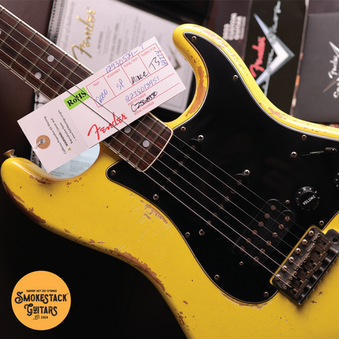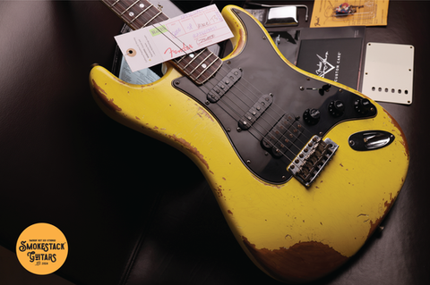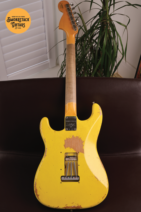 Fender 2023 Custom Shop Fall Event Limited Edition '67 Strat Heavy Relic in Graffiti Yellow with Quartersawn Maple (Medium Tint Nitro) Neck, Bound AAA Dark Rosewood Fretboard, 6100 Jumbo Frets, Lightweight Alder Body, Handwound Fat 64 Single-Coils (RWRP Middle) & Seymour Duncan 78 EVH Humbucker