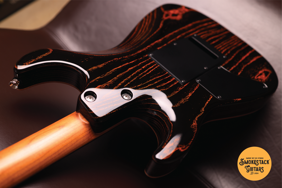 This Drop Top features a simply mesmerising Quilt Maple Top finished in a beautiful Blood Orange Burst (with scraped binding). This is matched to an equally entracing Swamp Ash Back in a wild & zesty Black with Orange Dog Hair finish - what a stunner!